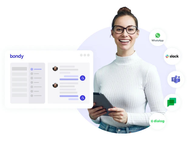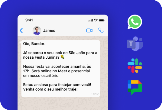 Implemente nosso chatbot com IA que tira dúvidas e entrega informações para seus colaboradores nos seus canais favoritos, como o Slack, Microsoft Teams, WhatsApp e Google Chat